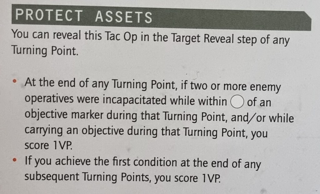 Protect Assets is revealed during any turning point. Score 1 VP for incapacitating 2 or more enemy operatives within white of an objective marker or carrying it that turning point. Do this in another turning point for a second 1 VP.