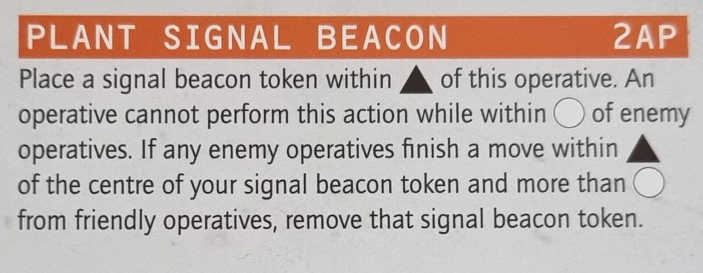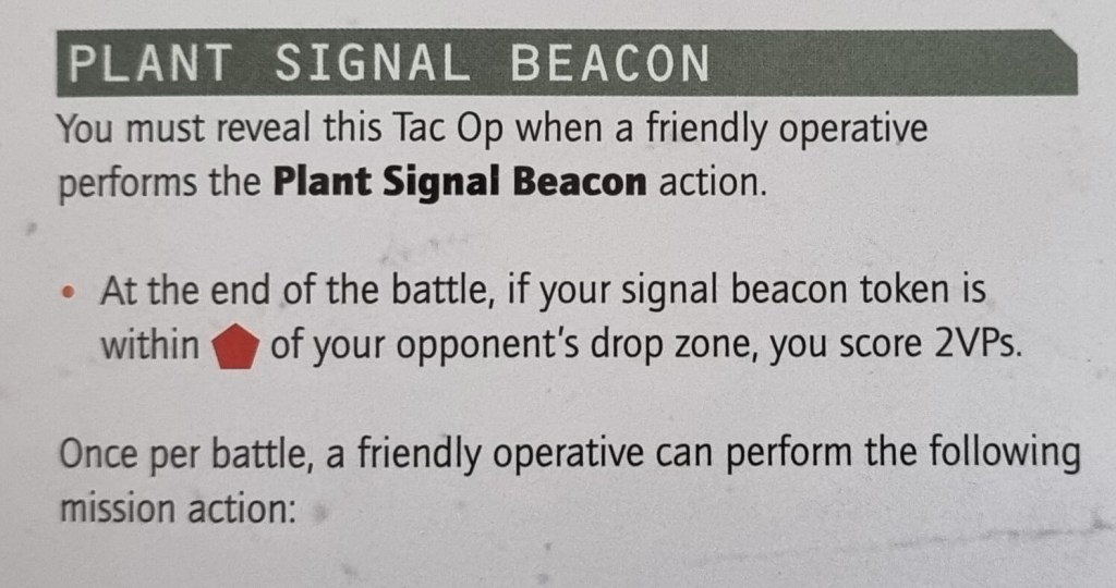 Plant Signal Beacon is revealed when you perform the plant signal beacon action. Score 2 VP if your beacon token is within red of the enemy drop zone. The plant signal beacon action is 2AP performed once per game and has to be placed within black of your operative while not within white of the enemy. If enemy operatives finish a move within black of your token while more than white from friendly operatives, your beacon token is removed.
