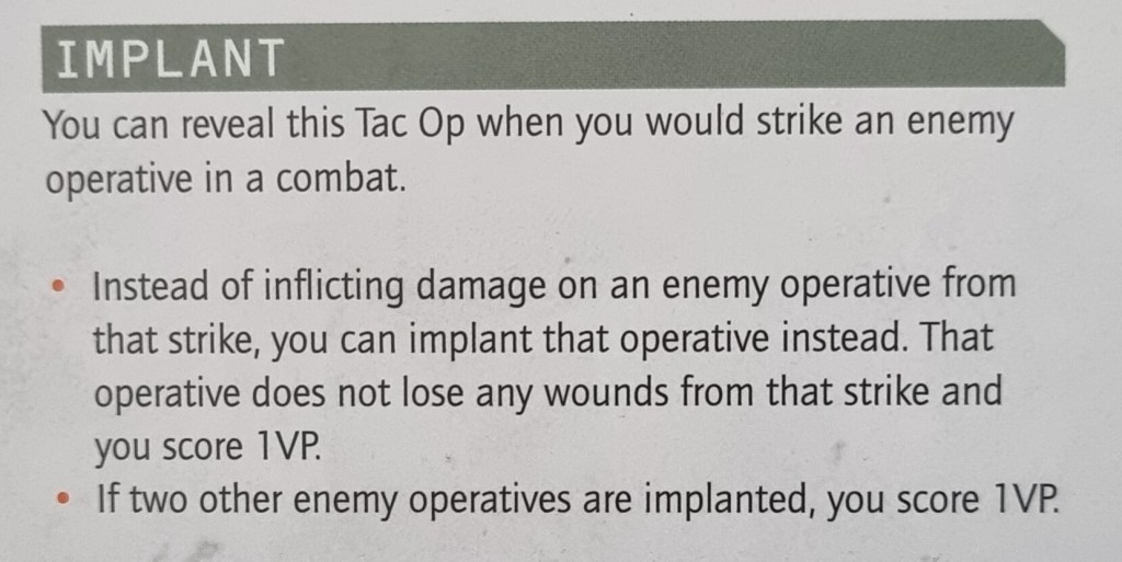 I feel this Tac Op is great for kill teams with lots of operatives. 2AP is a steep cost but if you were going to shoot with a lasgun or spending time to get a weak melee operative into position etc then it’s not such a big loss.