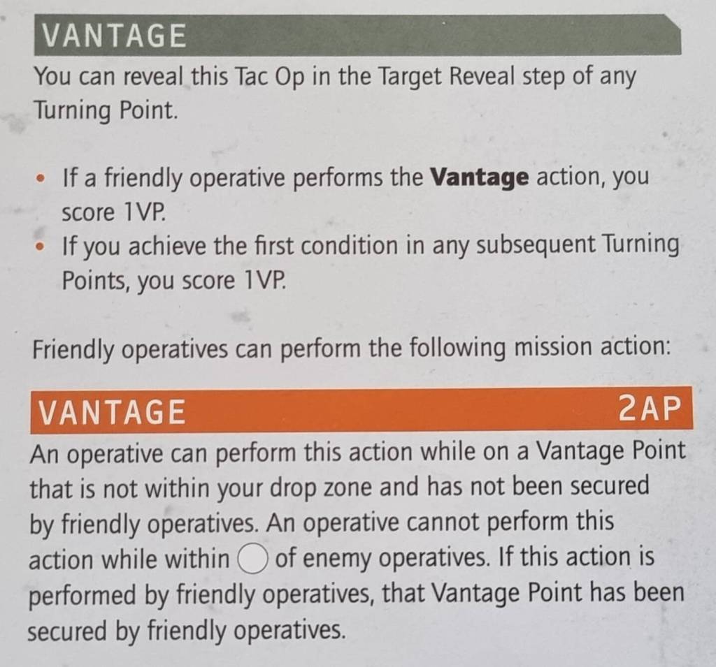 Vantage is revealed during any turning point. If a friendly operative performs the vantage action, score 1 VP. Do this in any other turning point for 1 VP. Vantage is a 2AP action which you can perform while on a vantage point. You cannot perform this while within white of the opponent and on a vantage point that has had this action performed on it already.