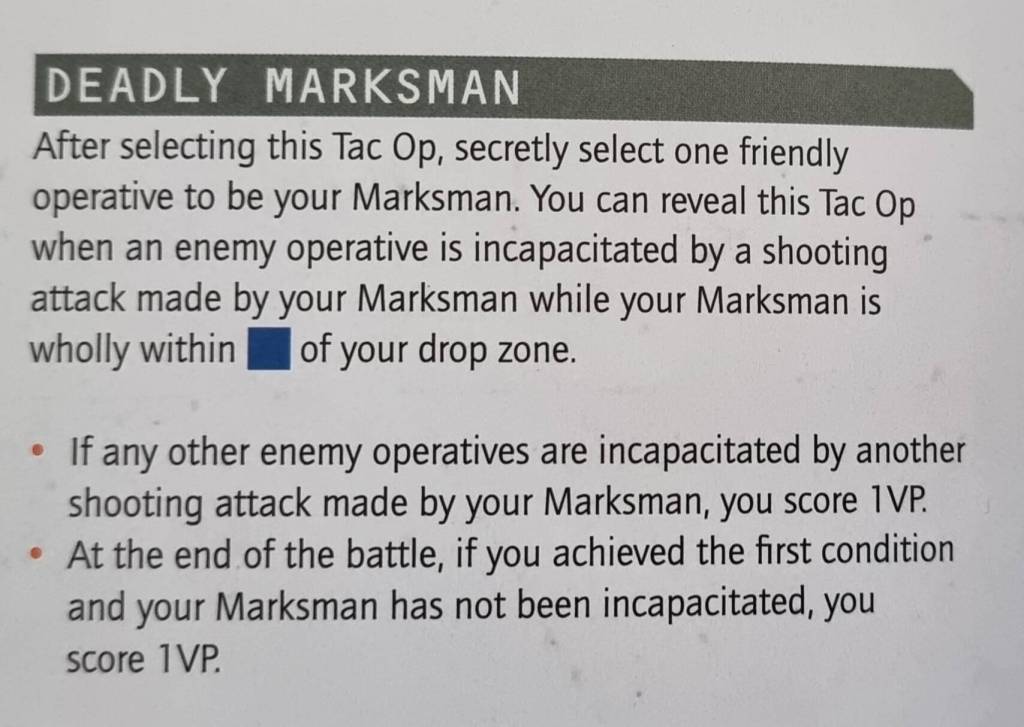 Deadly Marksman has you secretly nominate a friendly operative to be your Marksman. You can only reveal this Tac Op when your Marksman incapacitates an enemy operative while you are wholly within blue of your deployment zone. Then you score 1 VP when your Marksman incapacitates another enemy operative with a shooting attack. If your Marksman has not been incapacitated by the end of the game, score another VP.