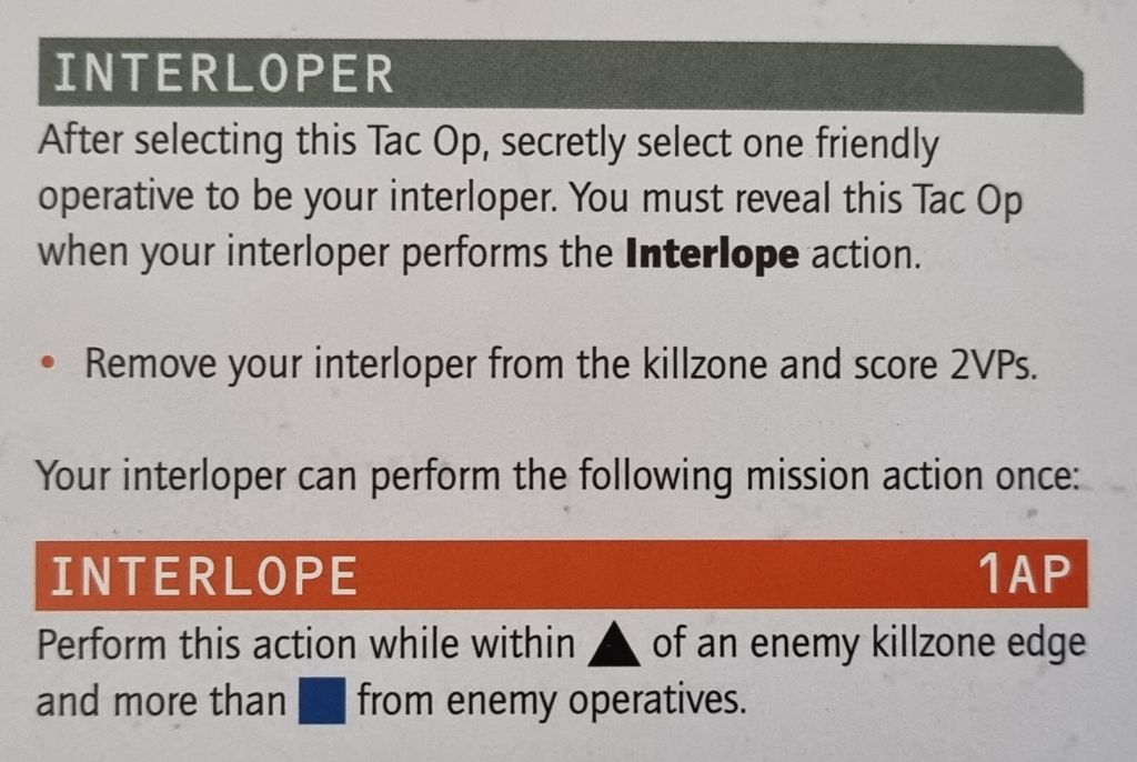 Interloper is revealed when you perform the interlope action. You have to secretly note one of your operatives to be the interloper. The interlope action is 1AP and can only be performed while within 1 black the enemy killzone edge and more than blue from enemy operatives.