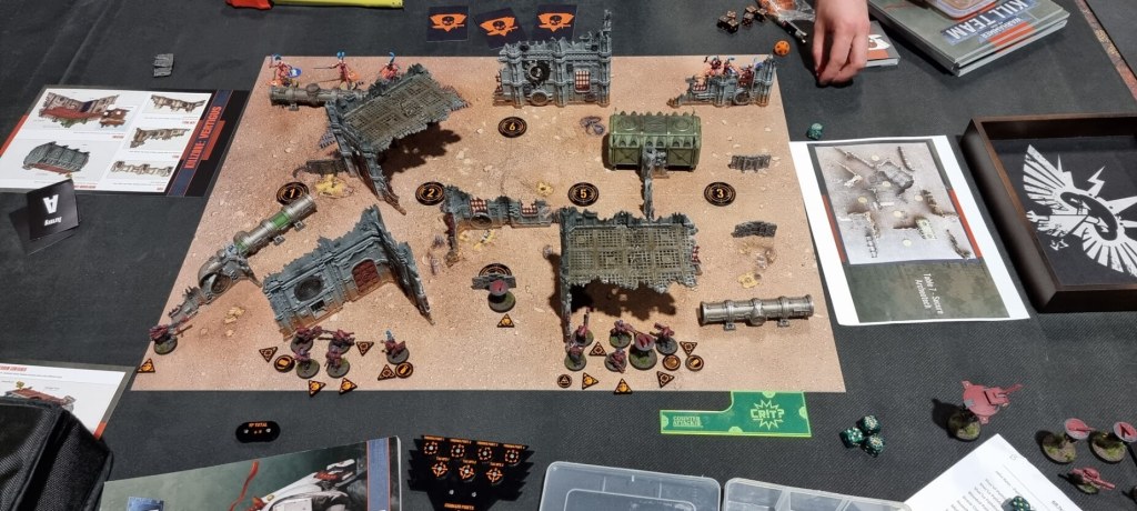 TP 1 I just markerlighted 4 quins to score my faction Tac Op 1 and used my Shield drone to claim the bottom objective via the Drone controller and with +1 APL. Interestingly my opponent pointed out to me you can drop something you pick up for free at any time. So he claimed 3 of the objectives and picked up some, then immediately dropped them to move them back 1-2 inches.
