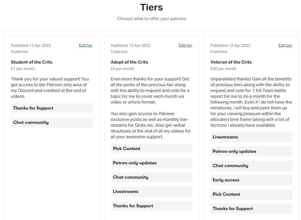Finally is Veteran of the Crits. This has all the benefits of previous tiers along with the ability to nominate and vote on factions for me to use in a batrep once a month (for the following month). I’ll provide a list of teams I already have but the additional time is needed in case I need to buy and paint up new teams to use. This tier is mainly for those big Kill Team battle report fans who want me to use whatever their heart’s desire. Please be gentle. I’ll be aiming to do 1 to 2 battle reports on YouTube for Kill Team per month and Patreon requested ones will always have priority.