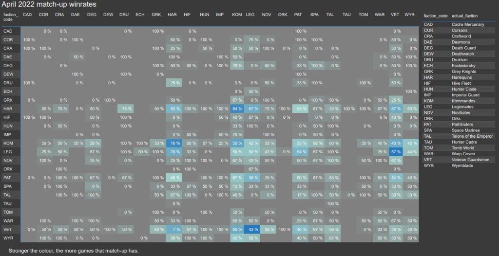 Overall for April, yeah, Harlequins are leading it all. Although big surprises are their for the popularity and success of the Legionary Kill Team. They are doing much better than expected and their high usage is coupled to lots of Space Marine players proxying the CSM rules for themselves. Perhaps we will also see a high usage for the Phobos team when they drop? Vet Guard and Kommandos aren’t doing as well as they were previously but are still highly represented. Novitiates are still doing well and, spoilers for May, are becoming a menace too. Hunter Clade continue to struggle which is just a shame to see.