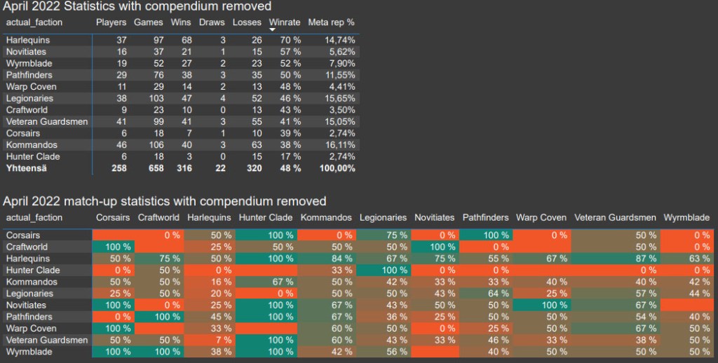 While this only shows percentages, we do record games played too which we can show off in the next update. Key things to take from here: Harlequins are only losing to Talons of the Emperor, all other factions give them a 50% win rate or higher and usually much higher than 50%. Legionary are doing surprisingly well, notably beating both Pathfinders and Vet Guard consistently who are their worst match-ups technically. Big wins for CSM there. Pathfinders are also doing not so well vs both Harlequins and Legionary, technically 2 teams that the Tau should be beating on paper.