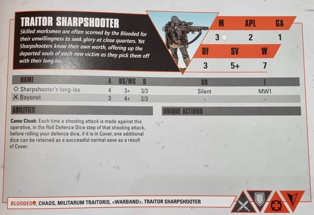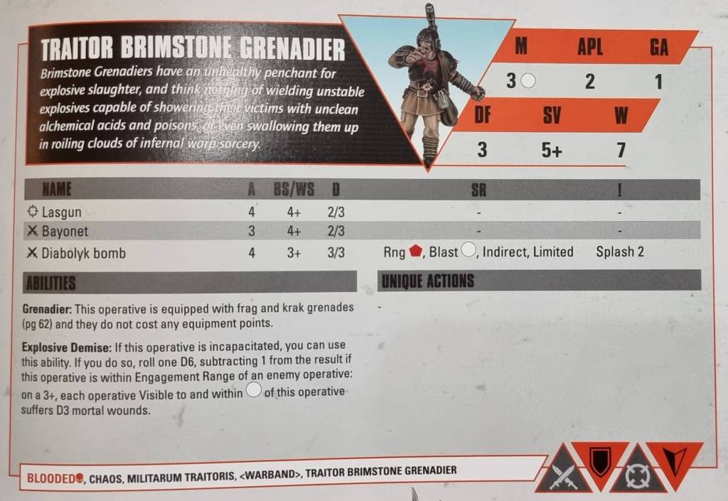 Operative-wise the Brimstone Grenadier is amazing because he gives you access to your 4th Krak grenaded while also having a better Frag grenade. The Butcher is a surprisingly good melee body with 8 wounds to boot. The Sharpshooter is fine but has a kinda redundant camo cloak due to firing silently. The Trench Sweeper is pretty solid too but the shield should give a +3 save or count as heavy cover when you use it.