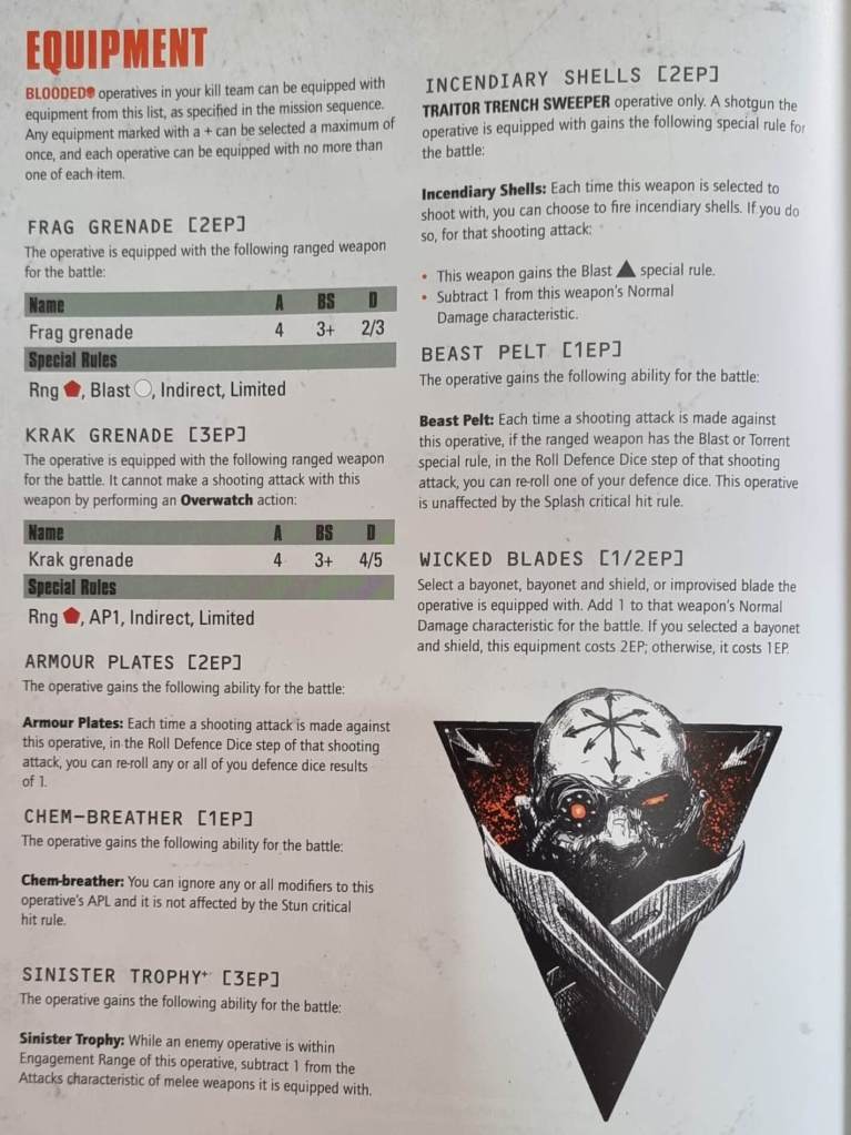 Equipment isn’t bad but just boring. 3 Krak grenades are your most useful pick with a Chem-Breather on your favourite model. A bit disappointing really and helps highlight the current problem with grenades that Kill Team has. Flamer shotgun shells are fun however.