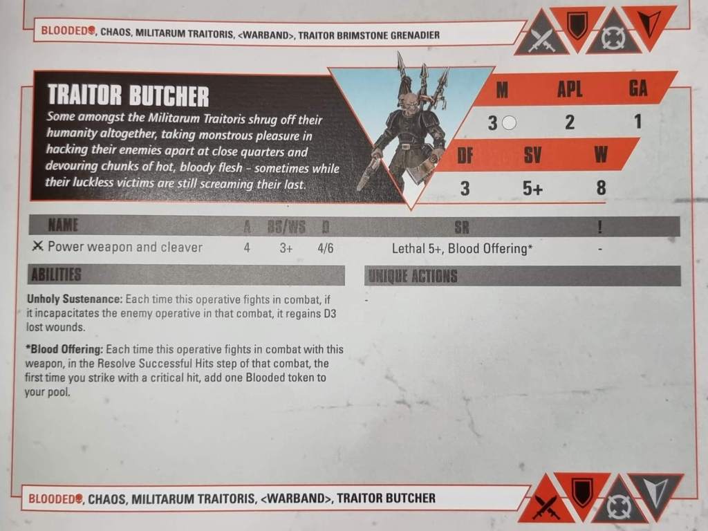 The Blooded Kill Team are the Traitor Guard and the second kill team in the Moroch box. They have your average body of 7 wounds with a +5 save. You’re locked into Seek and Destroy which is rough and can only select 2 out of your 4 gunners so maybe a sign of change for Veteran Guardsmen too? Otherwise you have a roster of 10 operatives then either a selection of 4 Guardsmen or an Enforcer and Ogryn who count as 2 slots each.