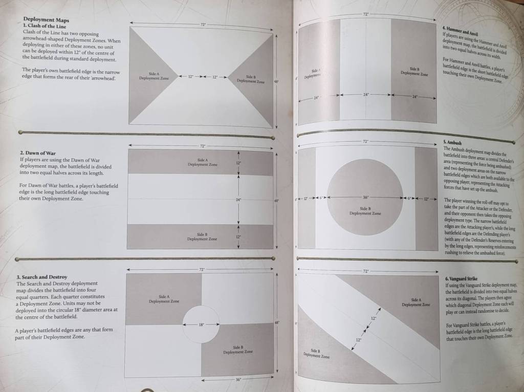 As for the missions, you get the 6 tweaked missions which came in the last edition. Table sizes remains the same at 6×4 but with 6 different deployment maps you can use with any mission. It’s interesting to stay at the same table size and not change to the table sizes used in 40k and AoS but I can understand why the table size did not change.
