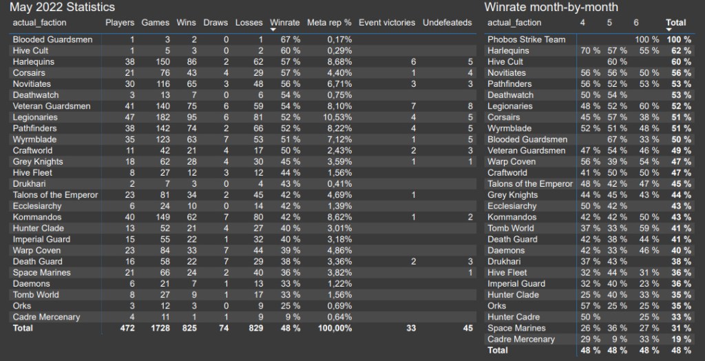 Here is the match-up data. I go over it more in the video but here is how each faction is doing against each other. An interesting note is with Legionary. Last month they were reliably beating both Pathfinders and Vet Guard, in May the stats have flipped and those 2 factions are now beating Legionary more. Pathfinders have also started krumping Void-Dancer Troupe which is another switch from April.