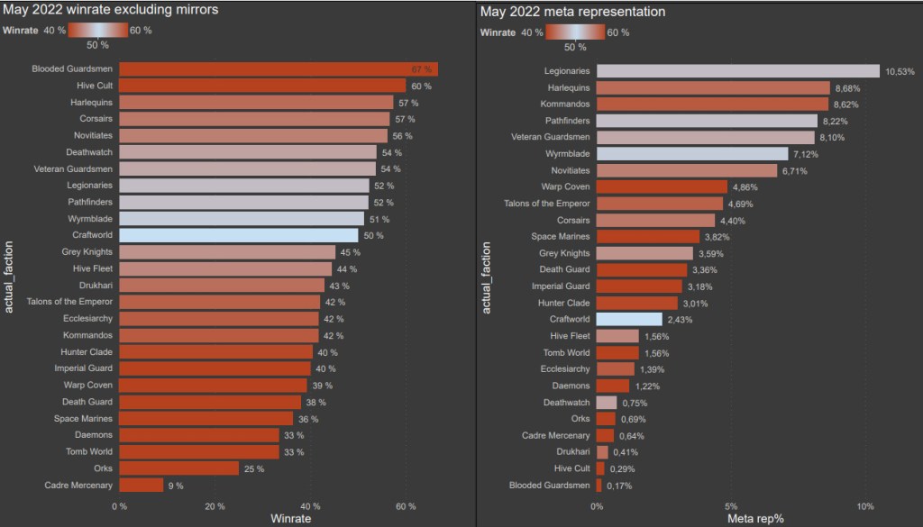 With mirror-matches removed, winrates remain pretty much the same. Nothing too major here. To the right you can see the breakdown of popularity. Legionary and Void-Dancers remain some of the most popular factions with Kommandos still holding ground. Vet Guard have dropped a bit while Pathfinders have jumped up.