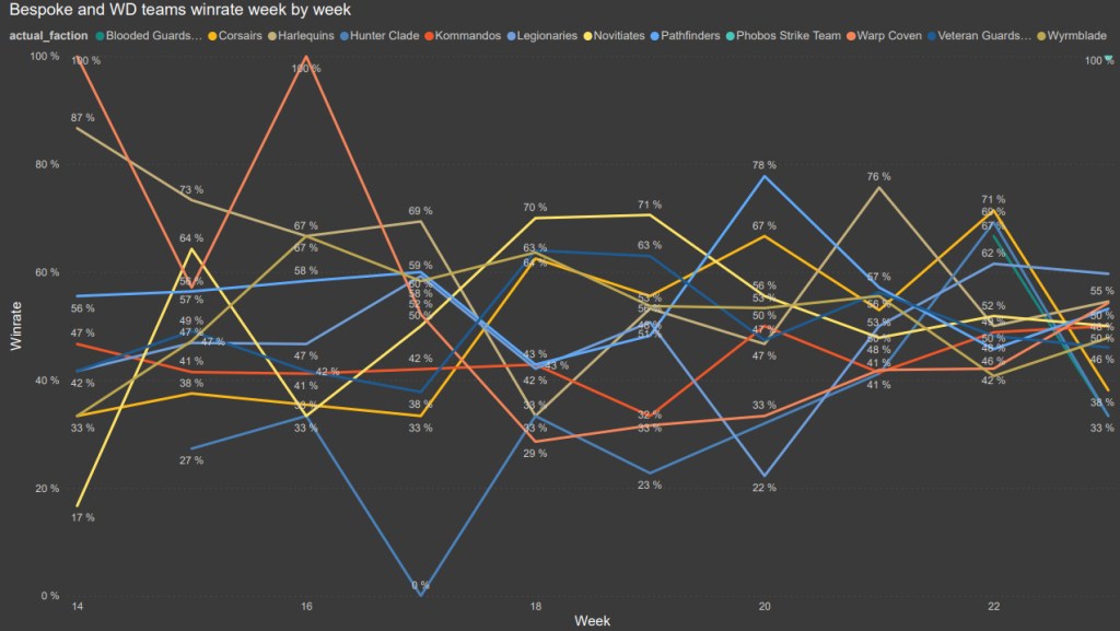 This is weekly winrates for May including only bespoke and White Dwarf teams. It’s a bit erratic but shows how results can differ quite drastically on a week-by-week basis. Despite Warp Coven and Legionary being very up and down, overall its all pretty much closed out evenly. This is much better than what we saw at the end of April where there was a much larger disparity between factions.