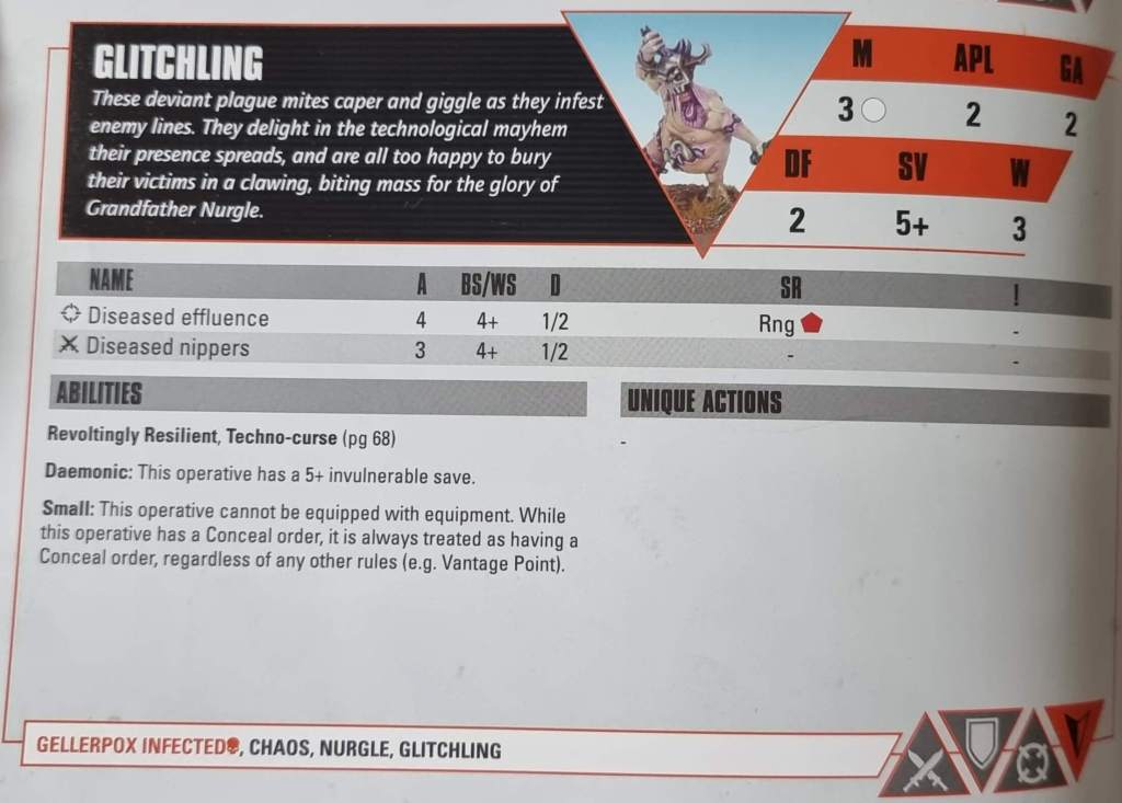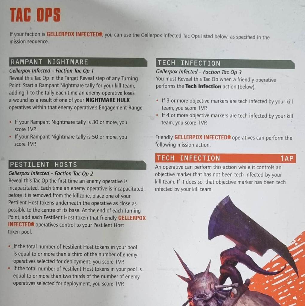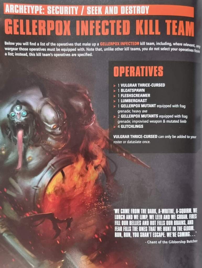 the Gellerpox have Seek and Destroy and somehow SECURITY. It feels really…wrong that these guys get Security and warps the power of the team. You have a small roster but looks are deceiving. Tac Ops are very solid for the most part and combine really well with Security. Ability-wise the kill team basically has a +5 Nurgle DPR and the ability to worsen ranged attacks if opponents are too close.
