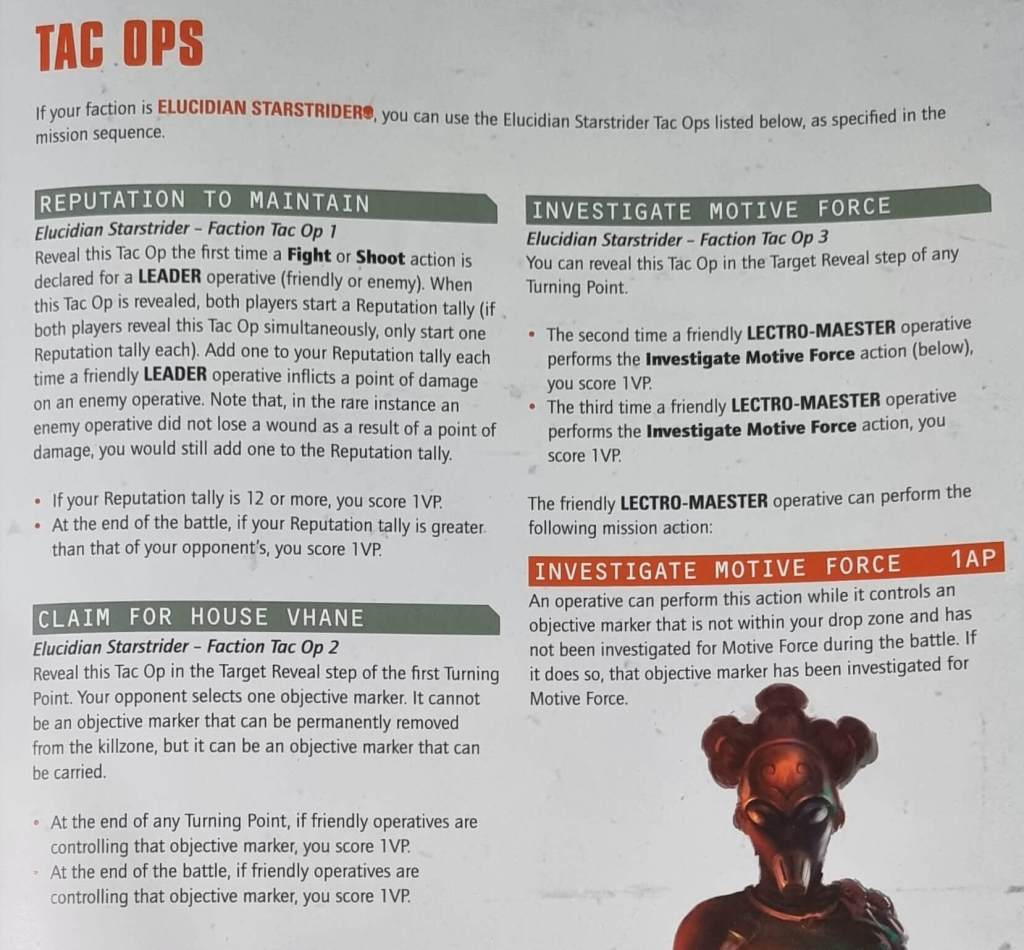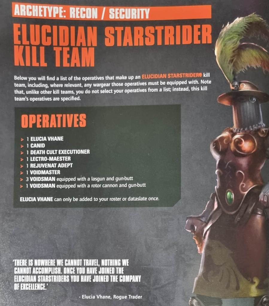 The Elucidian Starstriders have Recon and Security, which is amazing. You do have a fixed and low selection of operatives which does offset this though. Faction Tac Ops are pretty great too. What I love are the abilities and airstrikes. The abilities add a lot of thematic depth to the kill team while the airstrikes help remind opponents that you own a fleet of ships in orbit. Very handy.