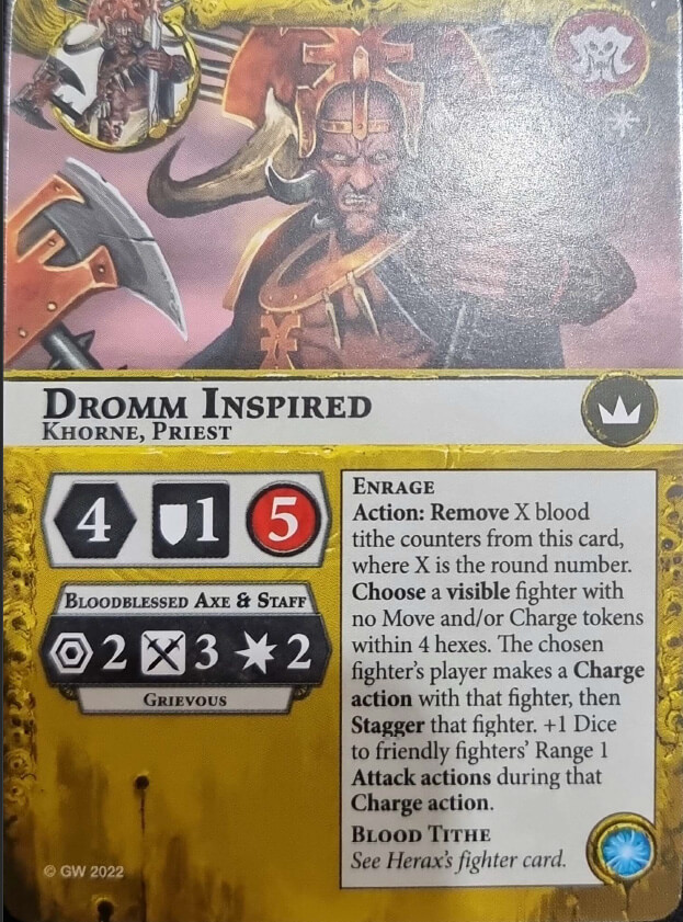 Herax is your blood priest and explains how Blood Tithe works. Everyone starts with 1 and gets 1 after an activation they took damage but not due to lethal hexes. It’s fine but not amazing. His attack is alright but I wouldn’t pay the blood tithe to get range 2. Shame he’s not 5 wounds.