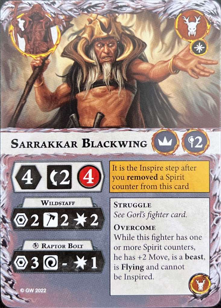 Sarrakkar (try saying that 3 times fast) Blackwing is your leader who is a level 2 wizard. 4 wounds with 4 move and 2 dodge is okay. Overcome is alright but the cannot be inspired. The inspire condition is warband wide but remember you only inspire at given inspire steps which are basically before and after you activate, not during.