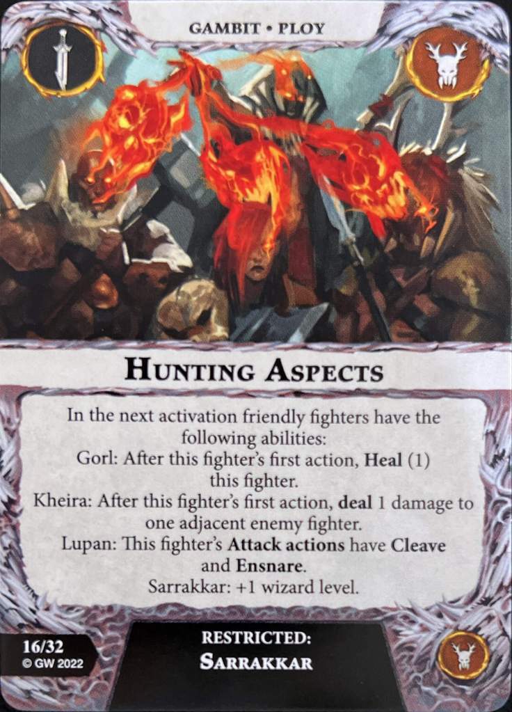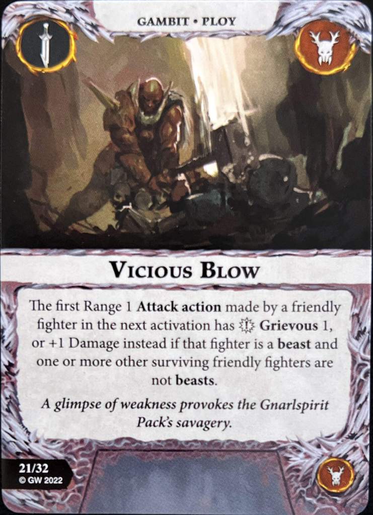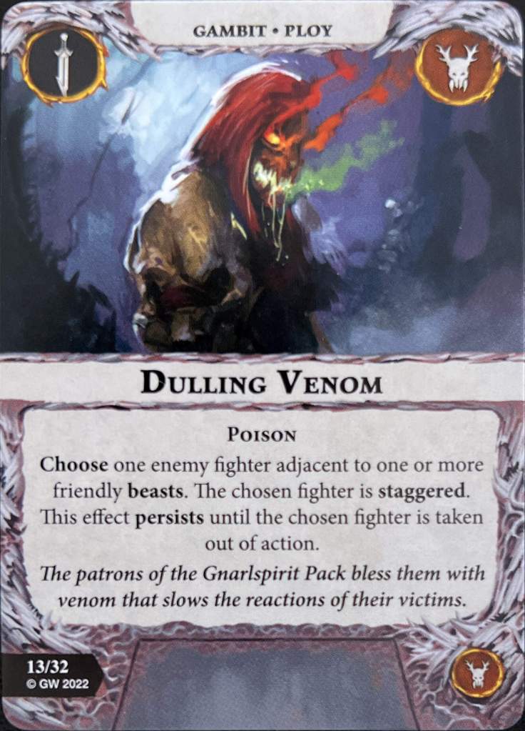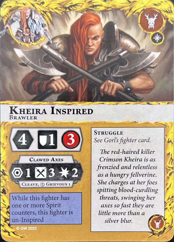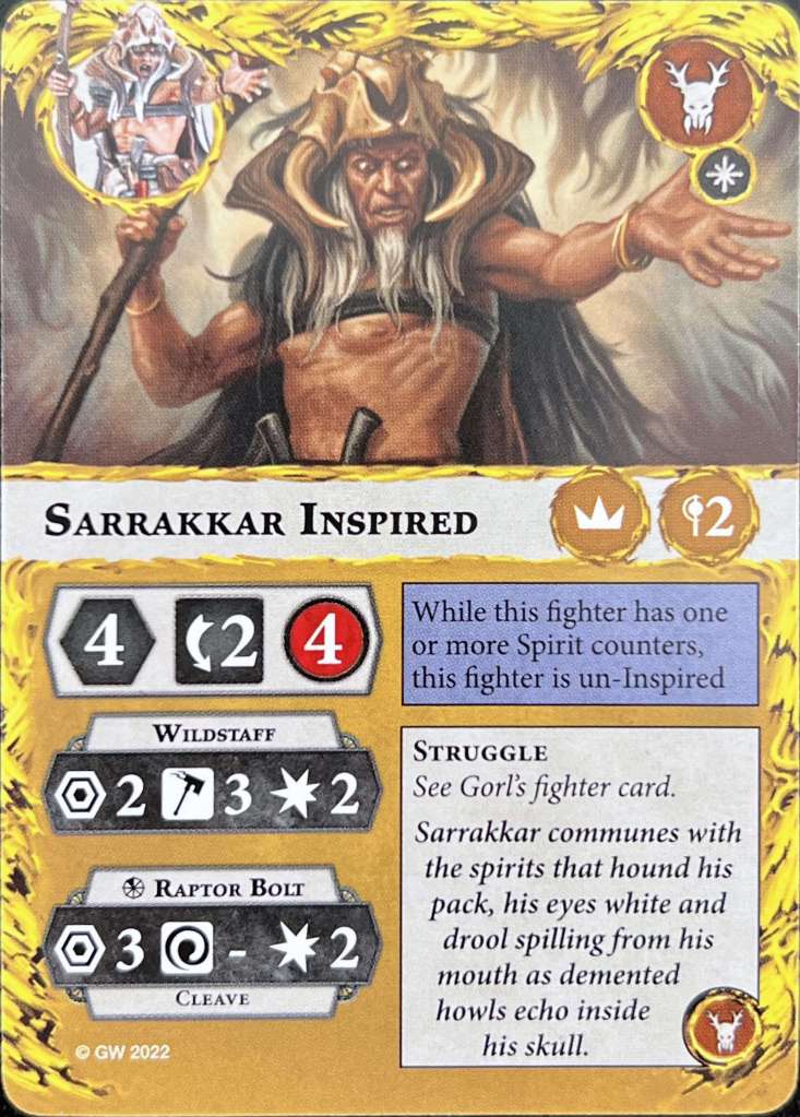 The Gnarlspirit Pack are a great aggro warband. They really own the 3 style fighter card of being un-inspired, overcome and inspired. They use some really great design space and an improved set of Oath cards from the Godsworn Hunt. Their fast but require a good balance between inspiring and being overcome. Really like these fighters. Very unique, powerful yet balanced.