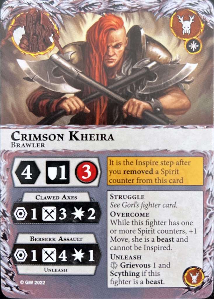 Crimson Kheira is also a Brawler. She is move 4 but 3 wounds. She has 2 attack profiles but Berserk Assault has Grievous and Scything on a crit which makes her excellent at blending hordes. While Overcome she gets +1 move which makes her even faster.