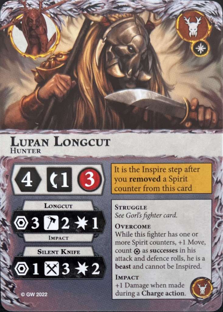 Lupan (the third) Longcut is a Hunter. Longcut does +1 damage on the charge while the Silent Knife is good too. When Overcome he becomes a very fast and real threat.