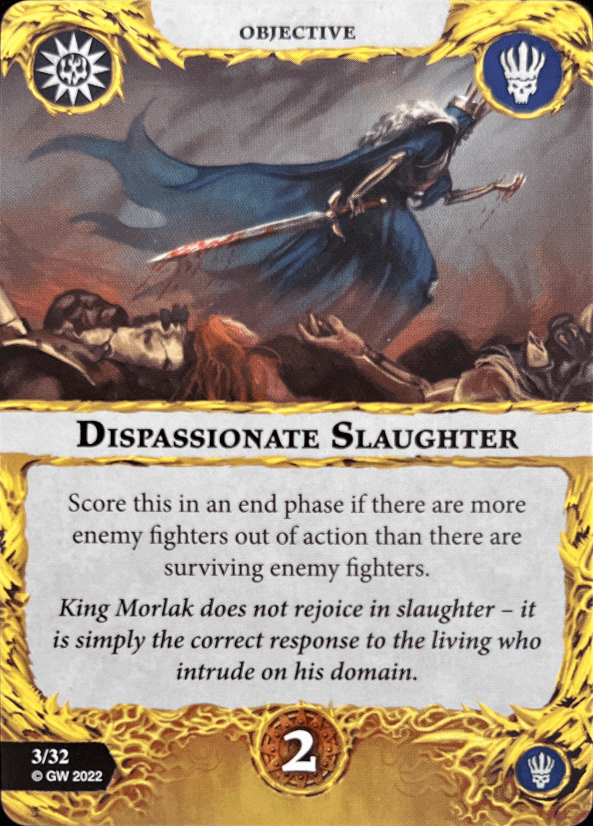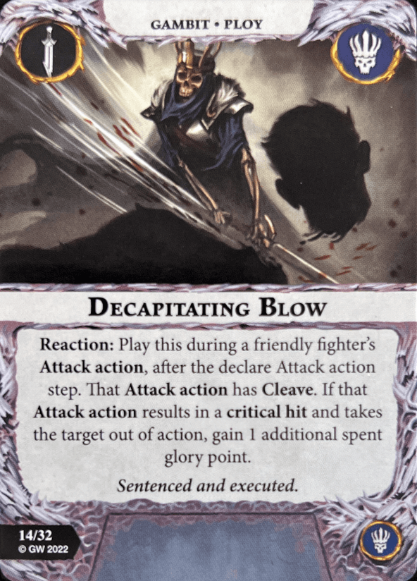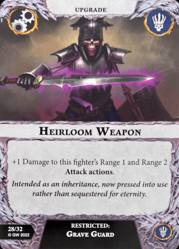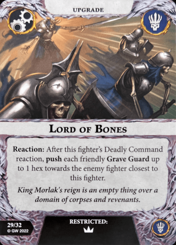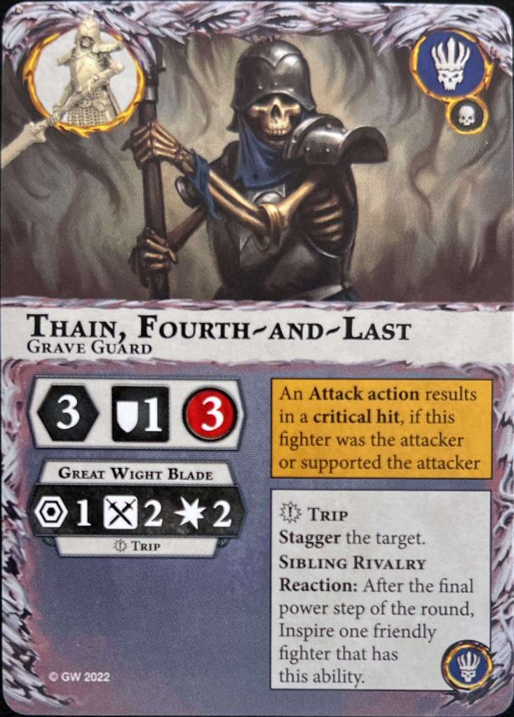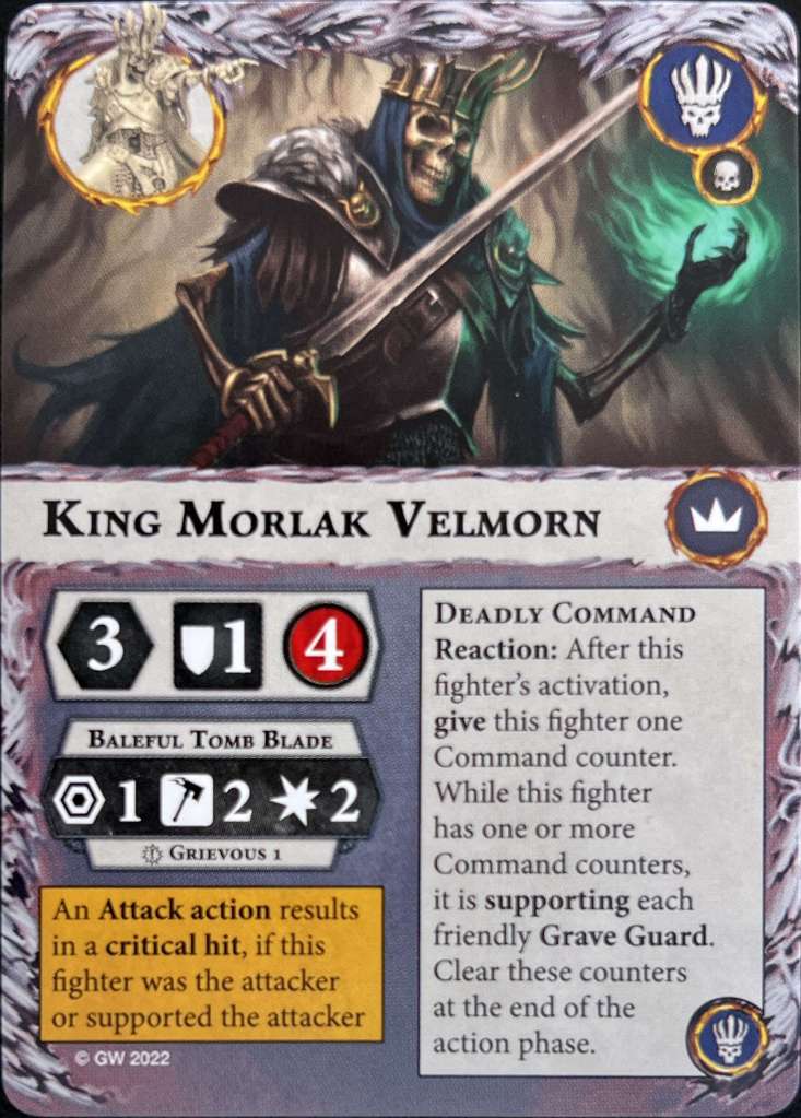 King Morlak Velmorn is your leader. He has 4 wounds with an alright attack that packs Grievous 1. He inspires when his attack is a critical hit or supports a friendly fighter attacking who gets a crit. What an amazing inspire condition. One of the best in the game. No bias. He shares this condition with the entire warband. He also has the deadly command ability. It gives him a command counter when activated which supports all friendly Grave Guard. Sadly they are removed at the end of the round so you have to activate him first to get the most out of it.