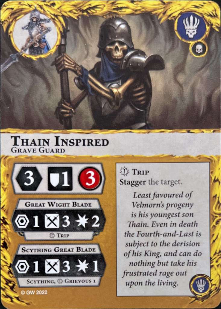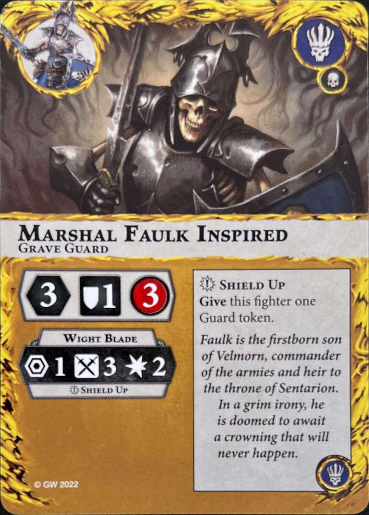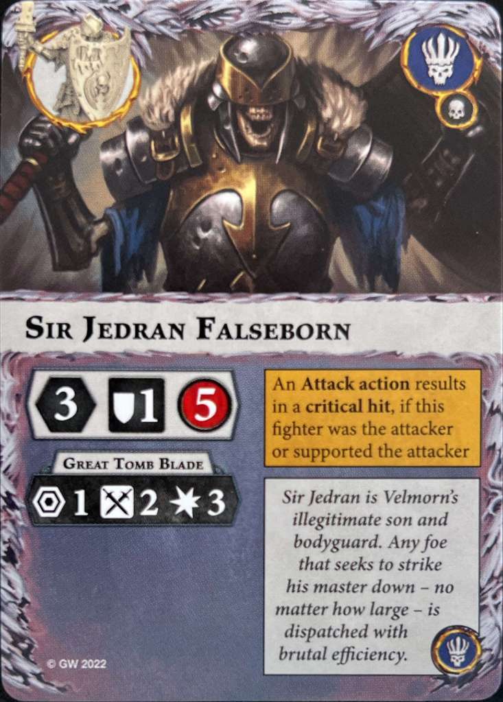 Sir Jedran Falseborn is your big tanky skeleton with 5 wounds. He has a 3 damage attack but hits on 2 furies. Otherwise nothing remarkable.