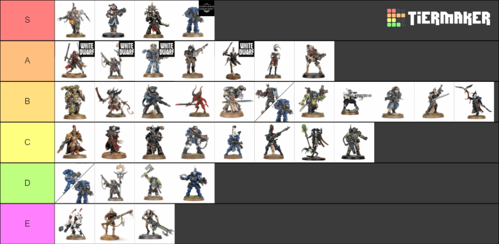 S Tier – A super strong kill team, one you’re very likely to see at a tournament that will definitely make the top cut and/or win an event too. Possibly broken but in realty just the best team(s) to play and only really lose to other S Tier teams match-up wise, ergo having very few to no bad match-ups.