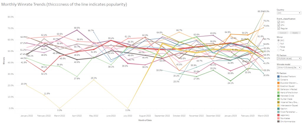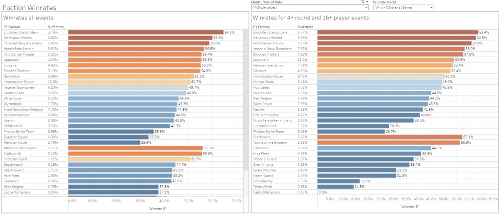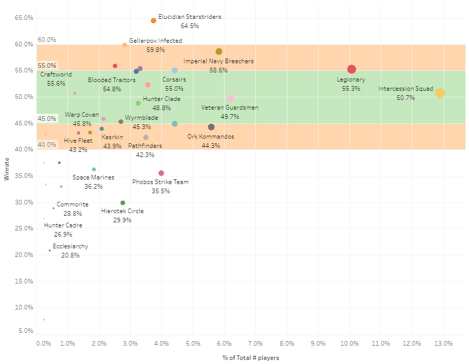 Looking at the February data, once again we have the usual offenders above 55%: Starstriders, Breachers and Troupe. Hand of the Archon are there too but with barely enough games to make it a credible result. On the losers side, Pathfinders shockingly have their worst winrate ever at 33%, joined by Wyrmblade who also had a really bad February. Exaction Squad didn’t do great but it’s the same situation as their Soulshackle counterpart. Too early to tell for both teams.