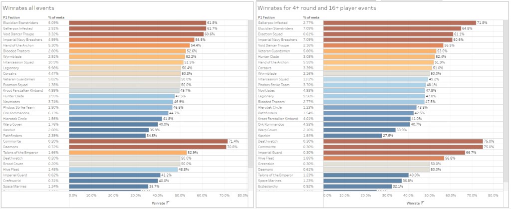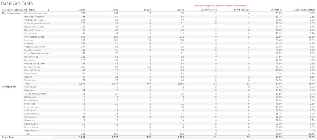 March continues the stable trend that has established for the top 4 teams: Elucidian Starstriders, Gellerpox Infected, Imperial Navy Breachers and Void-Dancer Troupe as they all have now consistently placed above 55% for winrates with the first two factions consistently placing above 60% for both normal and GT+ results, which is wild.