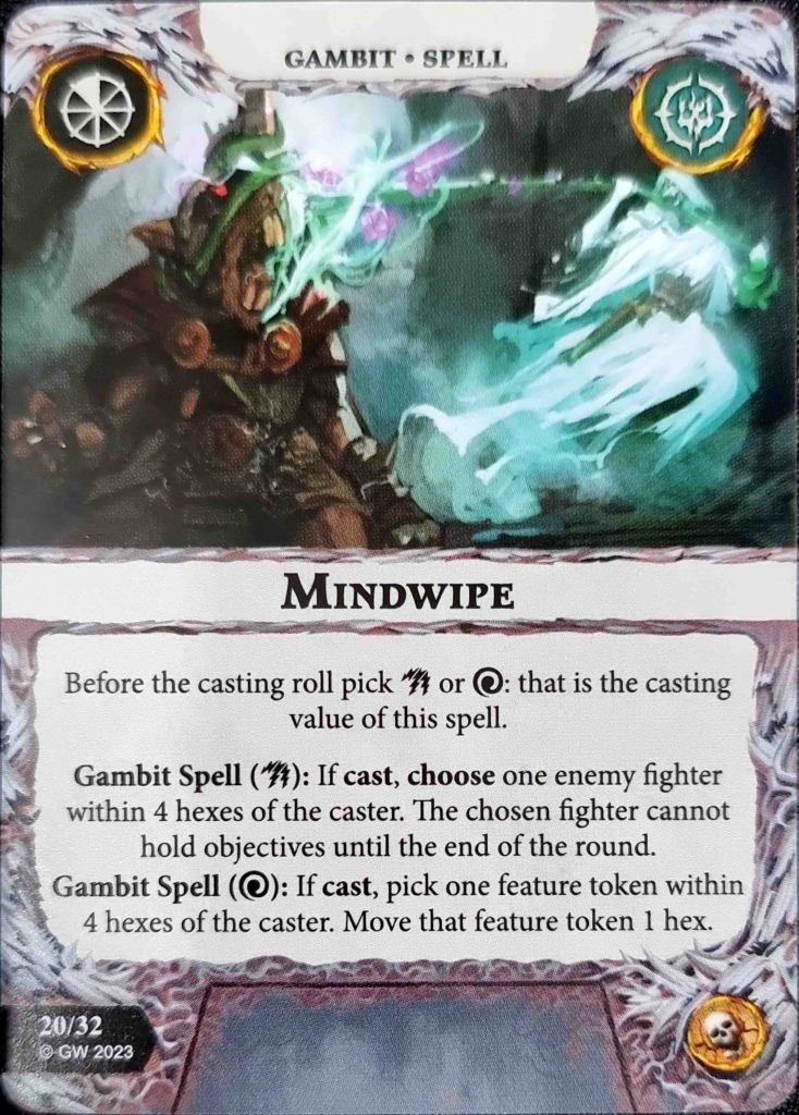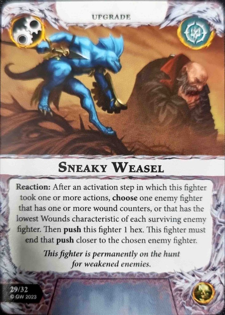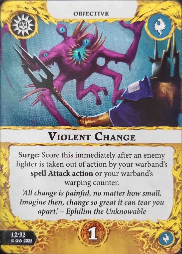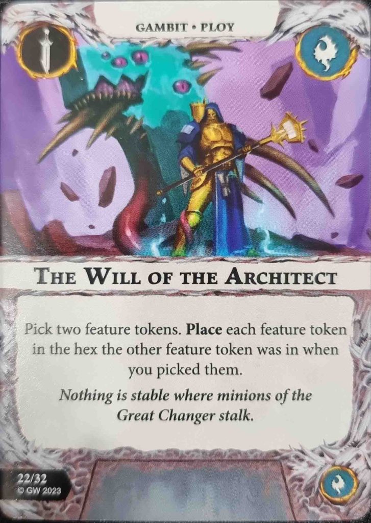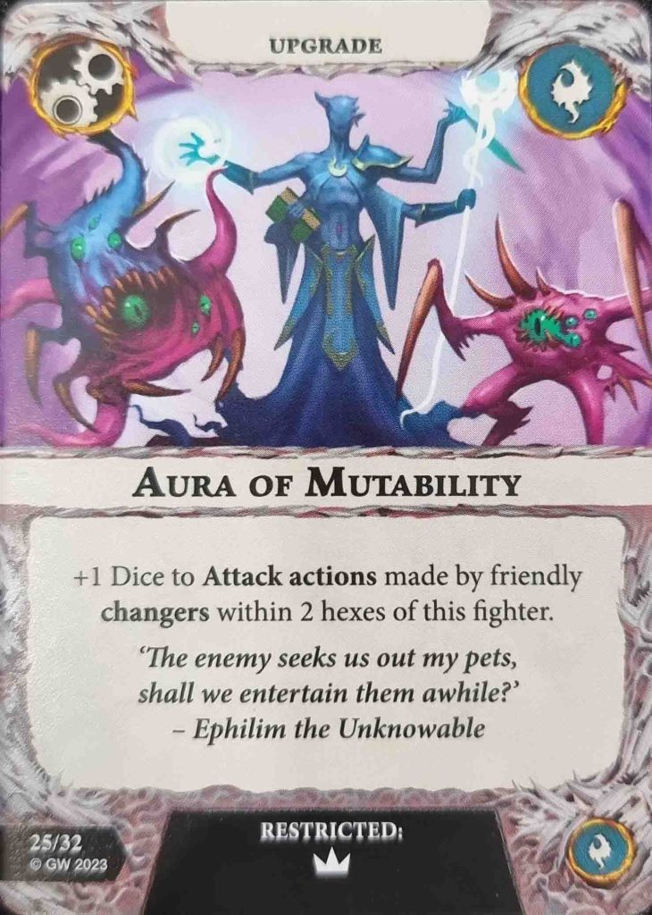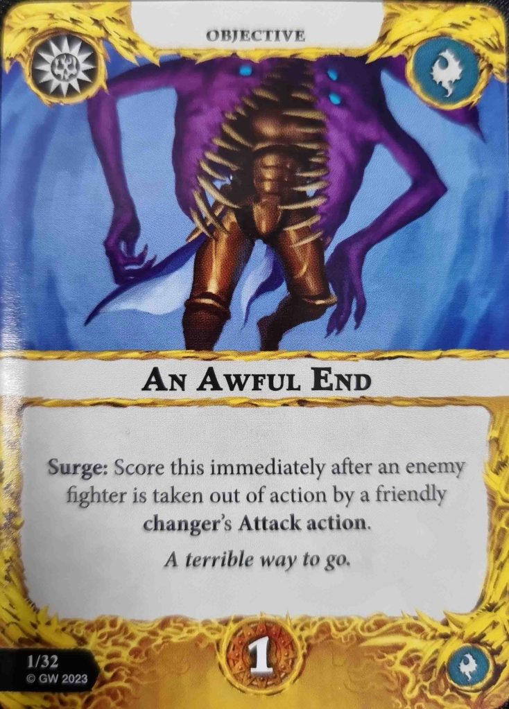 The plot card of this deck is very interesting. Basically after initiative you: inspire a fighter, stagger one, give one a guard token and push another. These apply to Changers so not your leader. You also have to resolve each in order, only stopping when you don’t have any fighters to apply the affect. This means if you had 1 Changer out of action, you’d stop at step 4 and so on. I like how staggering is at step 2. A great use of a plot card for a warband. Thematic and powerful.