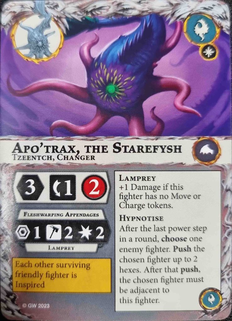 Apo- Your floating starfish daemon of doom flies. It also does +1 damage with it’s attack action if it has no move or charge tokens, which makes it surprisingly damaging. Hypnotise is also some great push tech. Inspiring gives +1 dodge and technically more of a chance of rolling a crit.