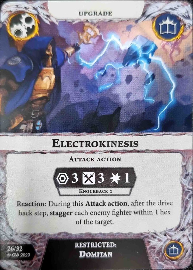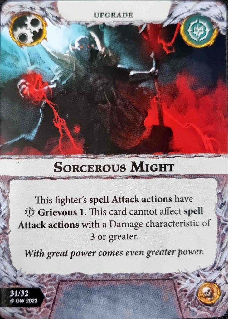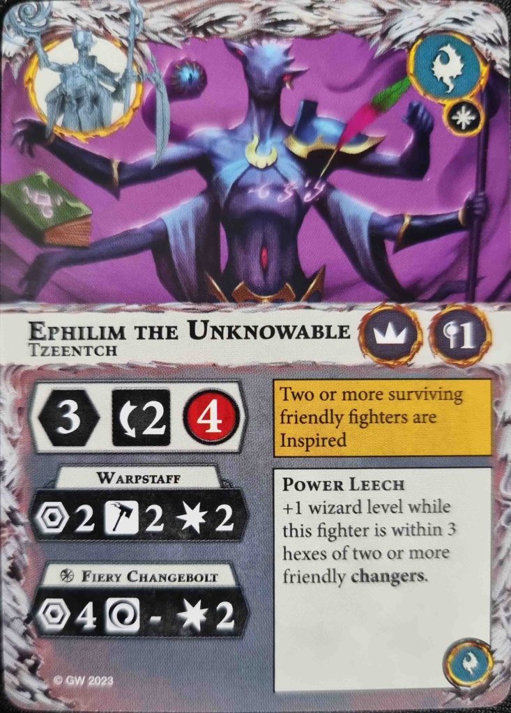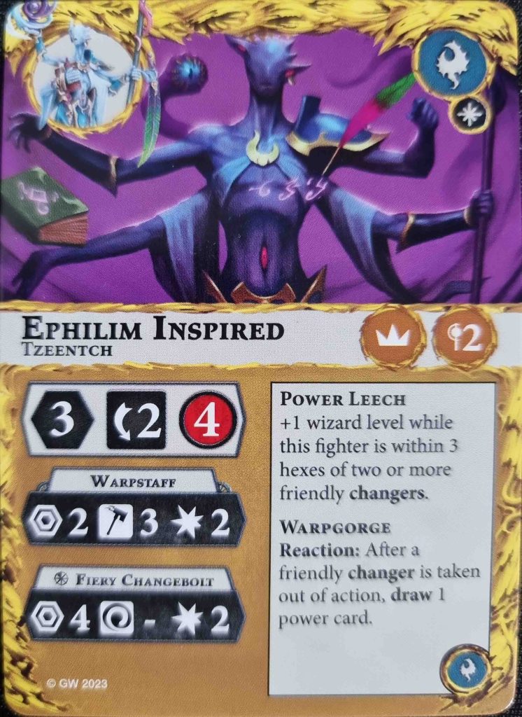 Ephilim is a level 1 wizard which goes to a level 2 while within 3 of 2 or more other friendly fighters. 2 dodge with 4 wounds is nice but the 2 ranged profiles are great to have, especially the range 4 Changebolt. Ephilim Inspired becomes an effective level 3 wizard which is amazing as well as the Warpgorge reaction that helps with great card draw. Plus Warpstaff becomes 3 smash.