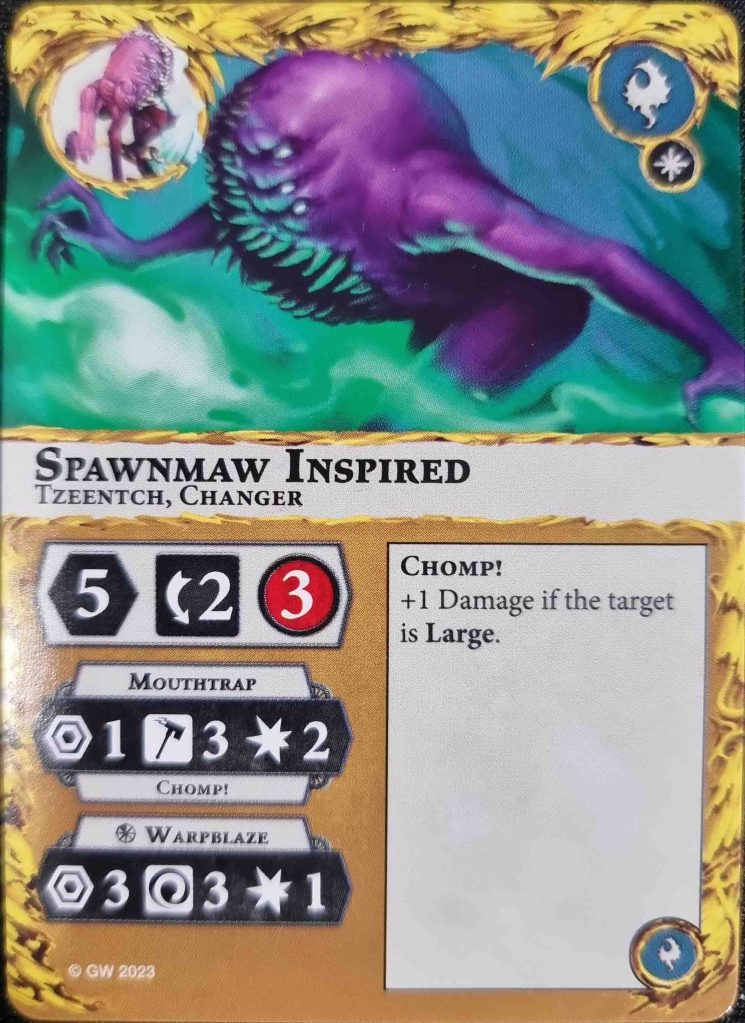 Spawnmaw is your main melee threat. movement 5 makes it fast with a decent melee attack and some nice ranged threat which is also a magical attack action. Chomp helps vs 5 wound or greater fighters too. Inspiring gives more defence and more accuracy.