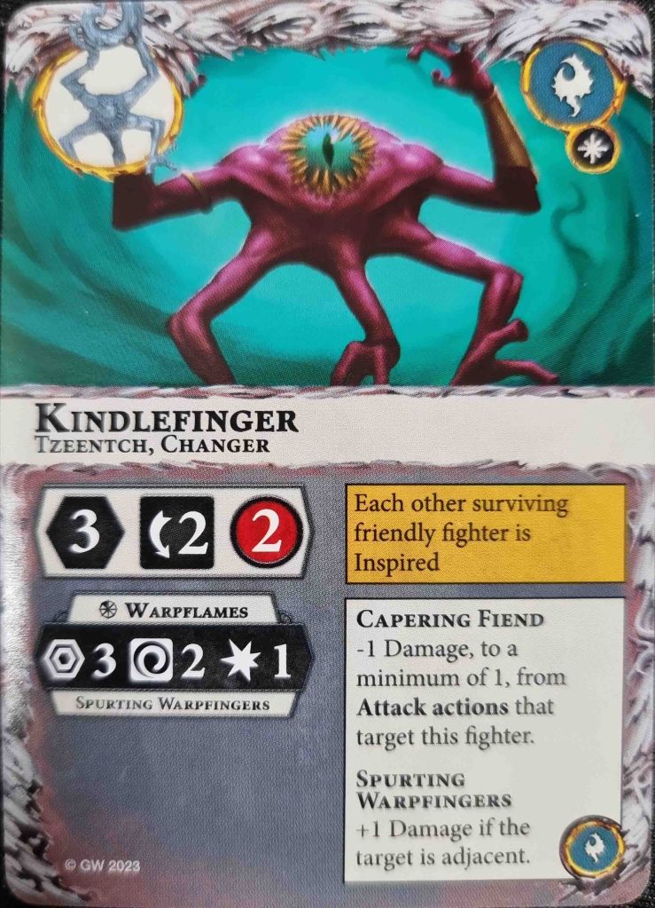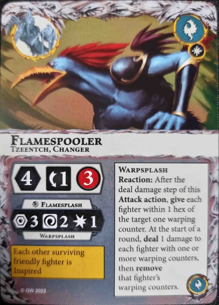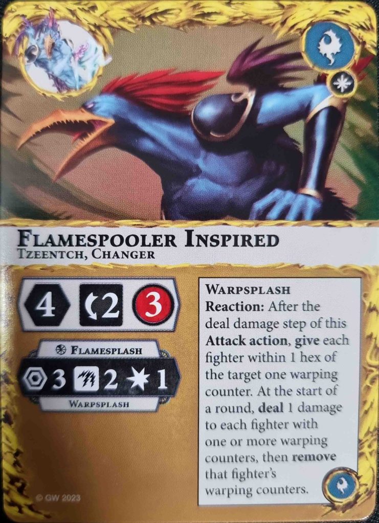 Flamespooler is a weird Tzaangor. Fast but fragile. Warpsplash is alright and makes Flamesplash even more threatening. It also counts as a magical spell attack which helps with objectives and power cards. When inspired, they go to 2 dodge and hit on channels instead of focuses, nice.