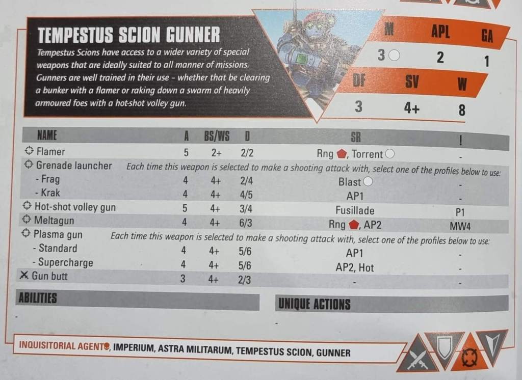 Your Pistolier is another great operative. Scoped plasma pistol has a decent infinite range profile along with great close-range profiles. Being able to double-fire both pistols at red range is amazing. Always take this operative. With this, your Gun Servitor and Ancillary Support, your kill team can have 3 sources of plasma!