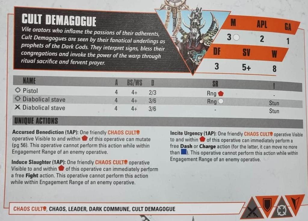 Your Cult Demagogue is your Leader who is incredibly important and is effectively a support/buff leader. Offensively she is not great but that’s not her role. Accursed Benediction is what you use to get your mutations rolling so you have 2 Mutants at Turning Point 1. Then Induce Slaughter and Incite Urgency make her a great force multiplier in TP2 on wards as she hunkers down near the mid-board.