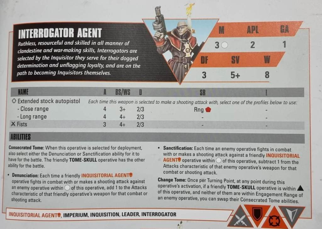 Operative-wise…your leader is possibly the worst leader in the game? He has some interesting buff/de-buff mechanics but I find the offensive buff works better with the Servo Skull. If the leader at least had +1 to hit on all profiles it would be a little more tolerable but the Interrogator oddly turns out to be likely the weakest operative in your kill team.