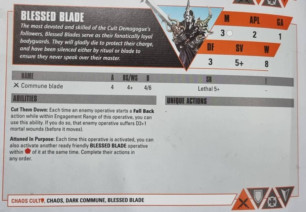 Blessed Blades (you get 2 of them) are interesting combat units. They come with power weapons but hit on 4s. Ideally, they charge into ongoing combats. They can also activate at the same time if within red of each other which is really good at cutting down your activation numbers.