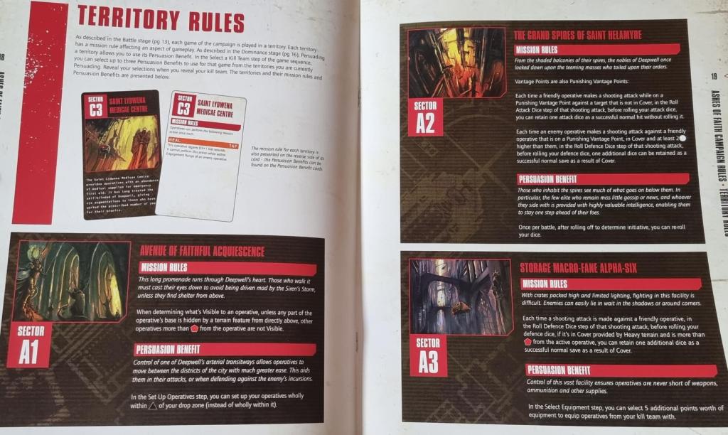 For each mission, you play in a different territory. You get several of both territories and missions, allowing you have to very varied killzones and games to play on. The territory rules are great as they can also allow you to theme your game boards around them. Overall just really nice.