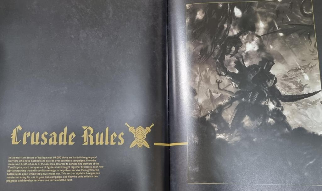 For the big book itself, it’s kinda weird. The new rulebook is 3 books combined into one. You get the narrative book, the core rules, then a crusade expansion book all included inside. What makes it weird is that they basically have separate numberings so you have 2 page 9s and so on. Just a very odd layout which confused me a lot at first.