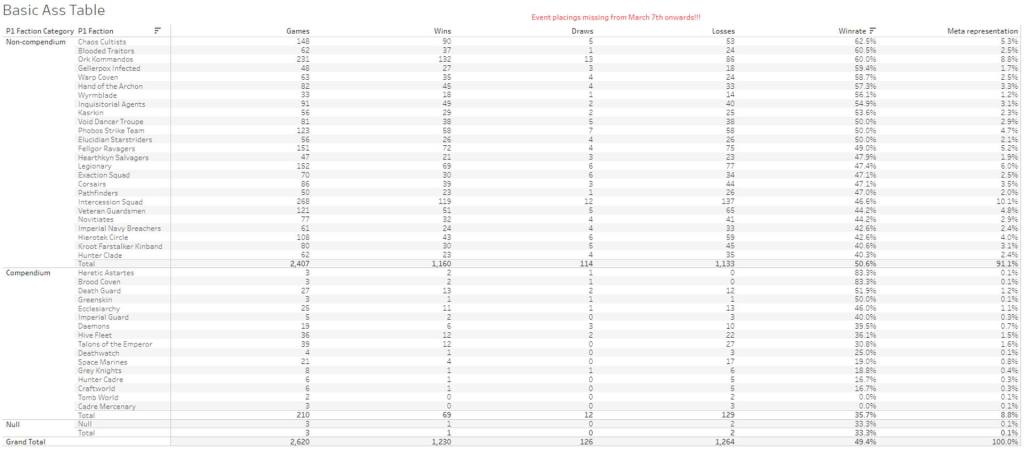 For GT+ results, Pathfinders take the top spot but with a very low usage rate. Chaos Cults actually do better in long-form events with a 65% winrate. Warp Coven continue to do well somehow while Kommandos remain mostly unchanged. The biggest take from GT+ events is how Intercession and Legionary both drop to borderline levels of winning while Fellgor drop down to 44% and the other under-performing teams are all usually strong and well ranking teams.