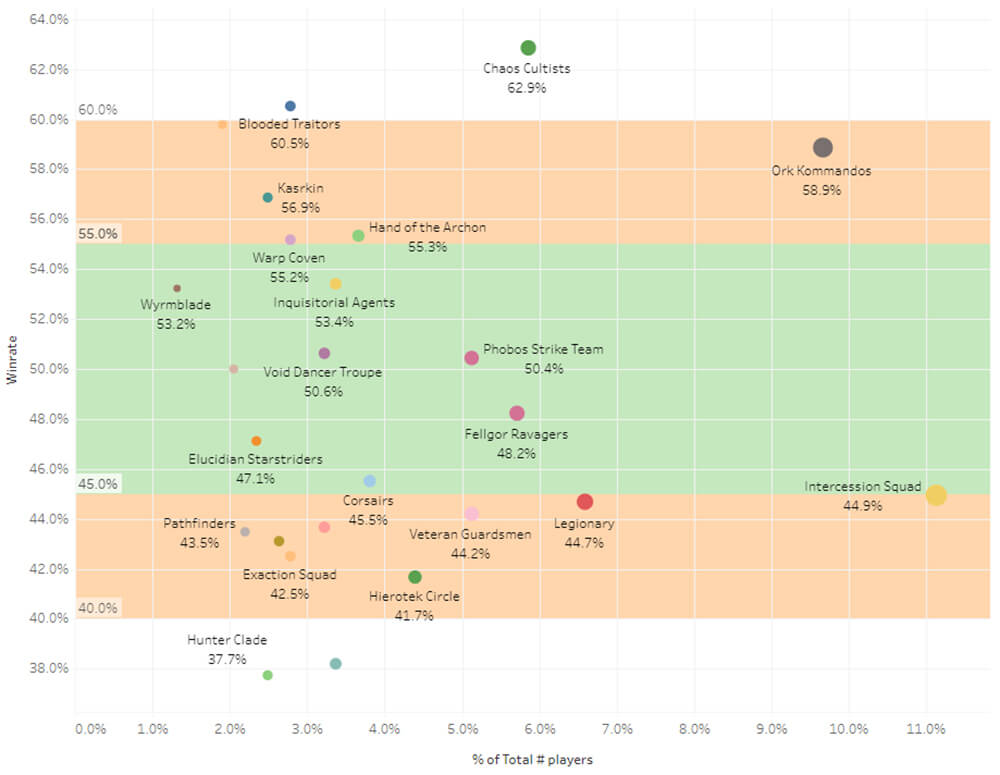 We once again have the July winrate graph. Remember green is good, orange means you need a buff or a nerf, whereas above or below is DANGER WILL ROBINSON territory. We have a pretty messed up graph this month, Chaos Cults reigning down on us all while Kommandos grow ever closer to taking over the popularity crown from Intercession. Down below at the bottom we have Hunter Clade and Breachers which just makes this month bizarre for stats.