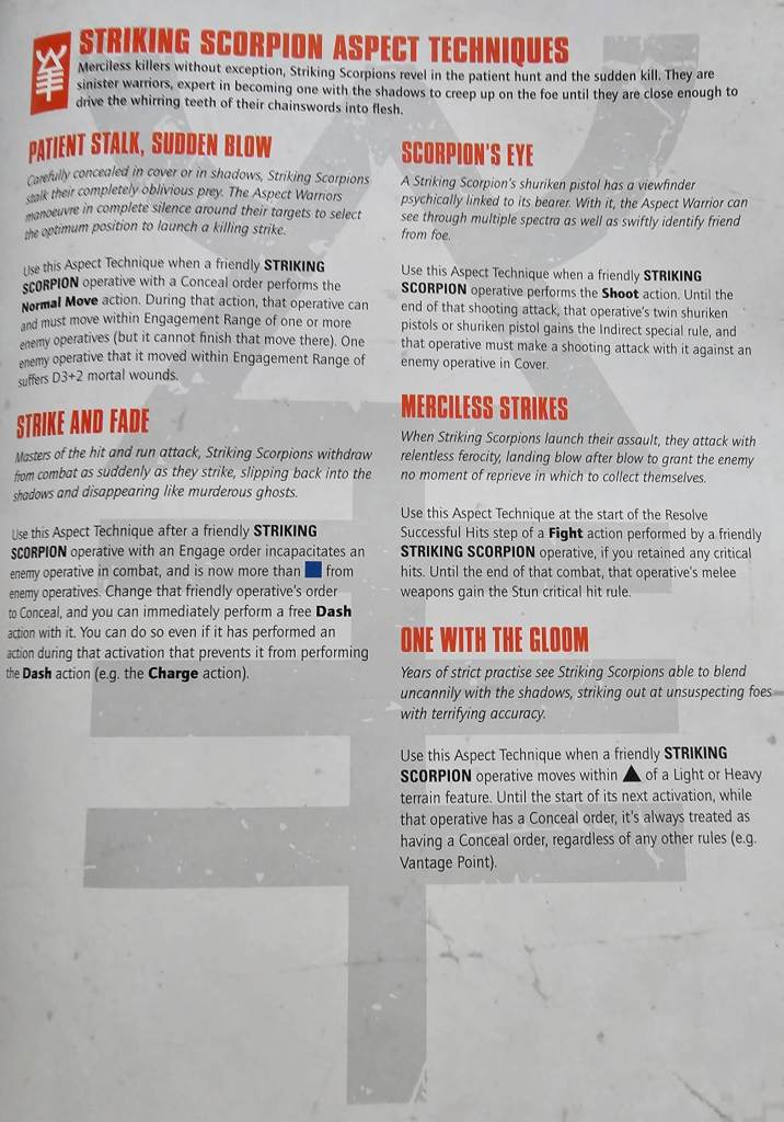 Overall the statlines are good but it feels like gameplay balance was prioritised over narrative. For example, Striking Scorpions have always had a 3+ save so it’s very strange to see them locked into a 4+ save. Melee Aspect Warriors only being 4 attacks too is very strange as it results in weird scenarios where other dedicated melee operatives out-fight them, it feels weird for Striking Scorpions and Howling Banshees being 4 attacks instead of 5. Dire Avengers being nerfed vs their compendium counterparts is also very strange.