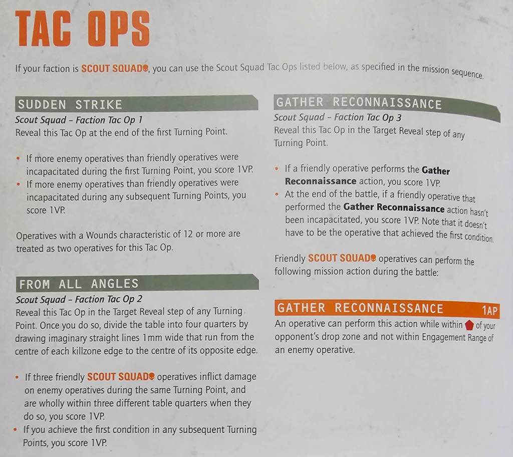 The Scout Squad are a Kill Team of 9 Operatives with access to Recon and Infiltration. Their faction Tac Ops are all about board control and getting early kills, effectively representing their role on the battlefield. Their unique ability is Forward Scouting, which are resolved after the setup operatives step. You get to 5 points to spend on each ability as per the brackets allows for said ability. These are all varyingly powerful and require observation on your opponent’s positioning and battlefield setup to get maximum usage out of.