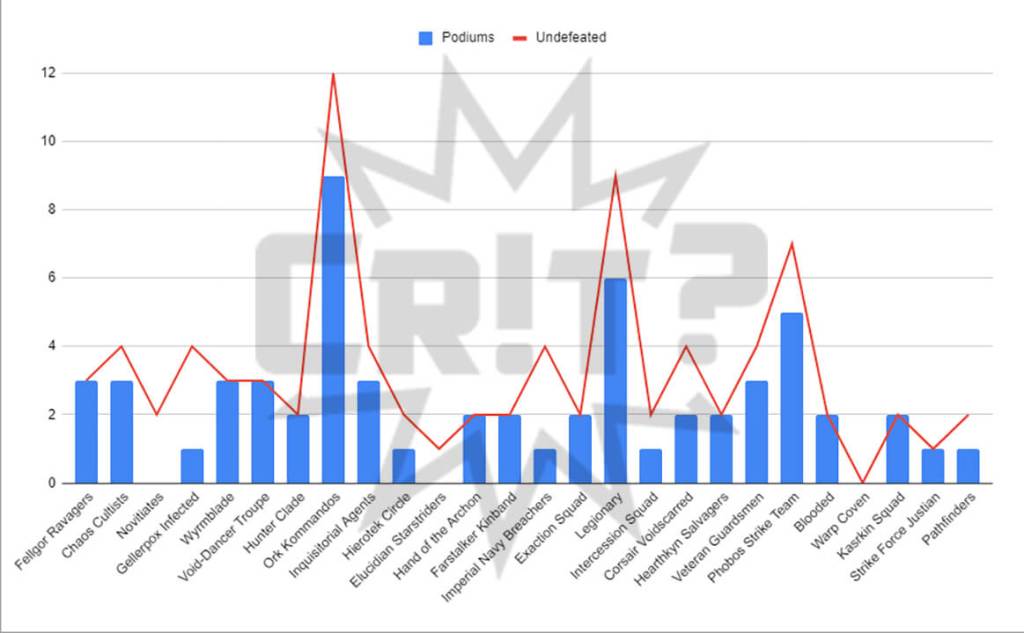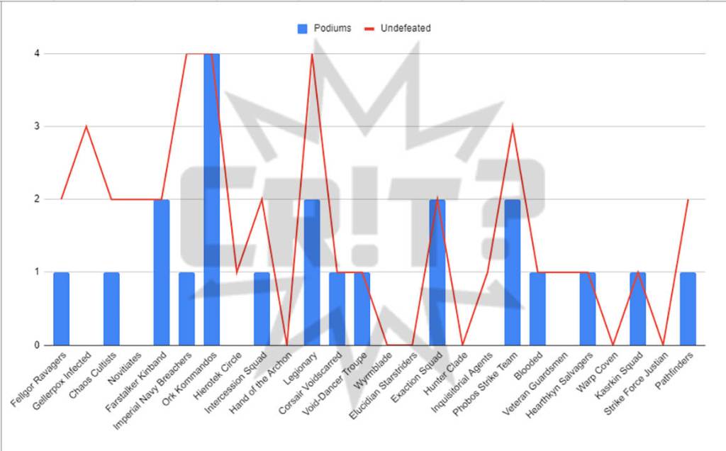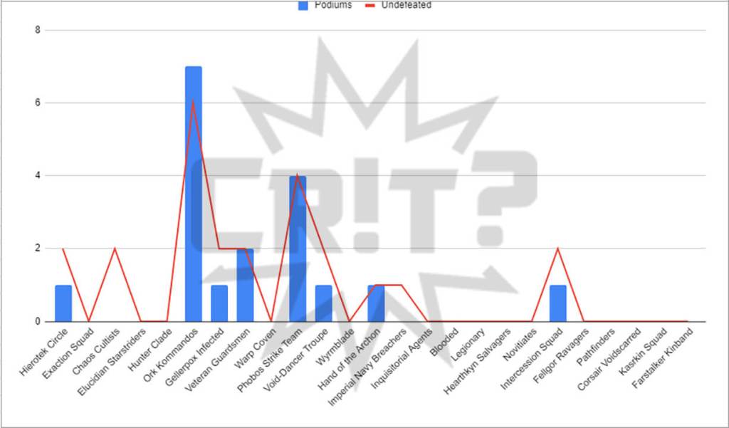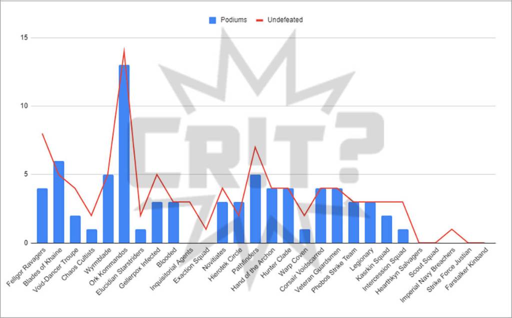 When looking at podium data, Kommandos crush everyone with 10 podiums and 10 undefeated players. Pathfinders join tie for 2nd-most podiums but with the 2nd-most undefeated players. Wyrmblade and Novitiates join Pathfinders whereas Fellgor and Corsairs claim 3rd place for podiums.
