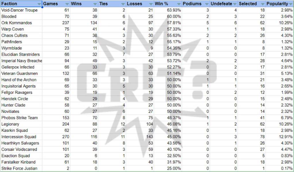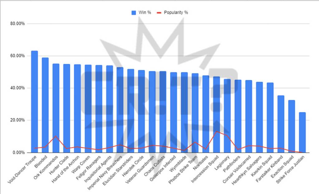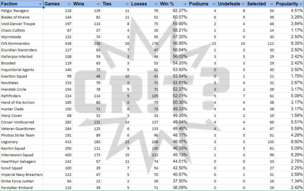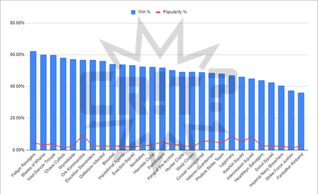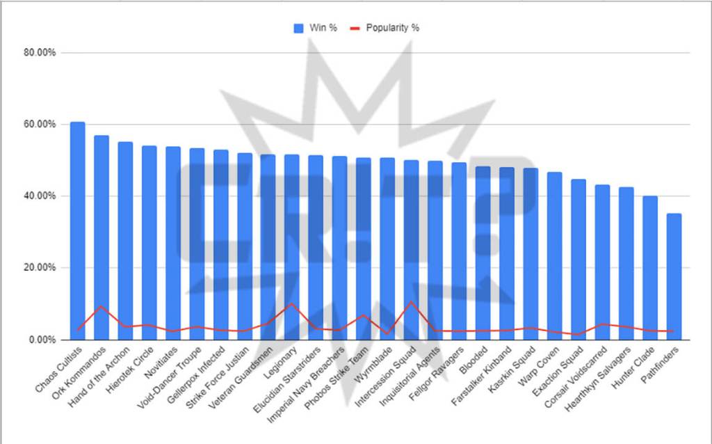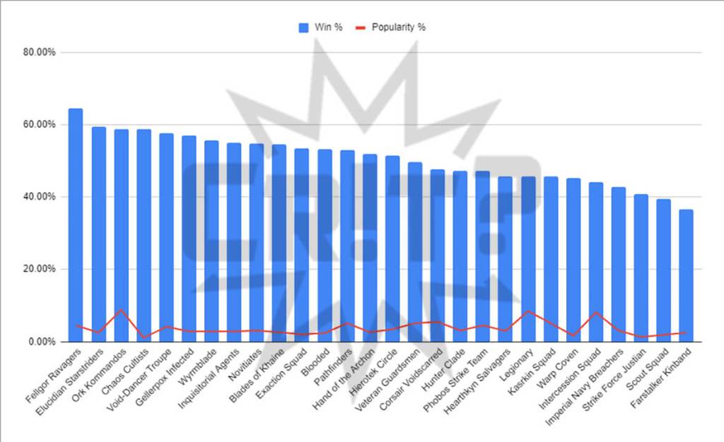 In another weird month, Heirotek take the lead with 65%, followed by Chaos Cult, Warp Coven, Kommandos, Phobos, and Wyrmblade. On the low side we have Hearthkyn, Corsairs, Fellgor, Kasrkin, Pathfinders and Kroot.