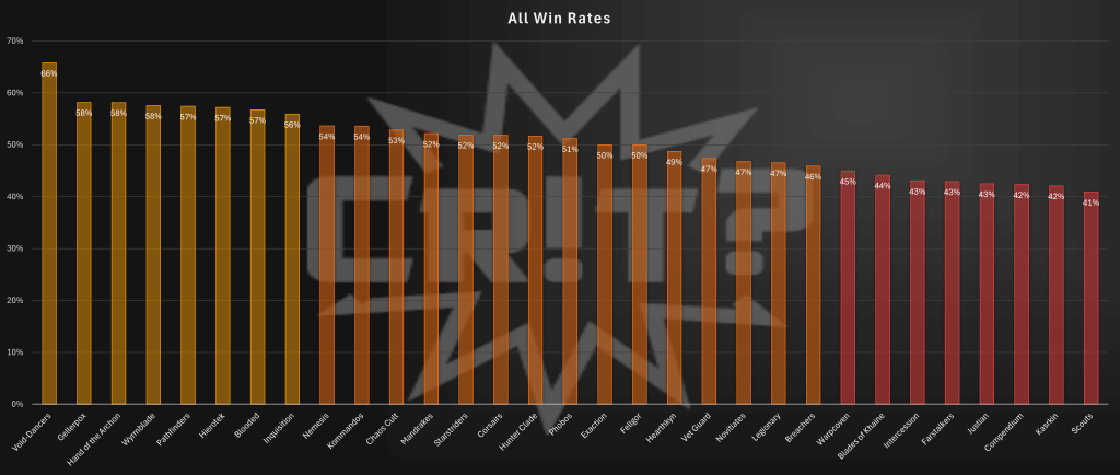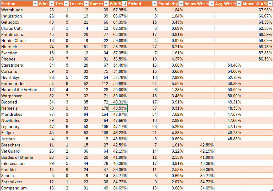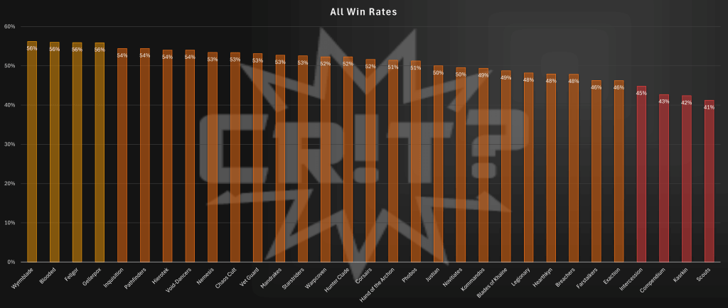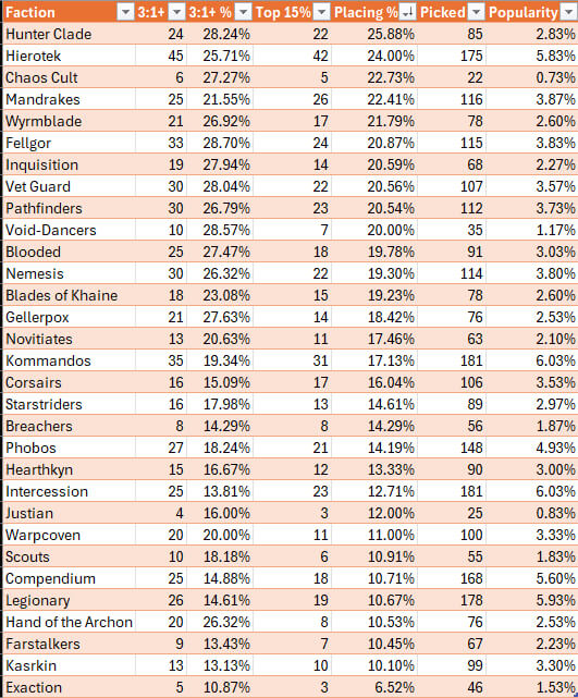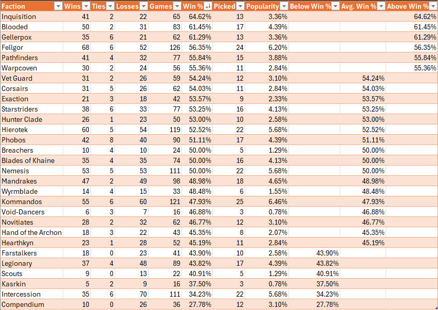 Void-Dancers shoot up but with only 19 games, become unreliable. We have also excluded factions with less than 10 games which is why less show up in May. Gellerpox, HotA, and Wyrmblade all hit 58%, while Pathfinders, Hierotek, and Blooded are at 57%, with Inquisitorial Agents at 56%. On the low end we have Blades of Khaine at 44%, Intercession at 43%, Kroot at 43%, Justian at 43%, Kasrkin at 42%, and Scouts at 41%.