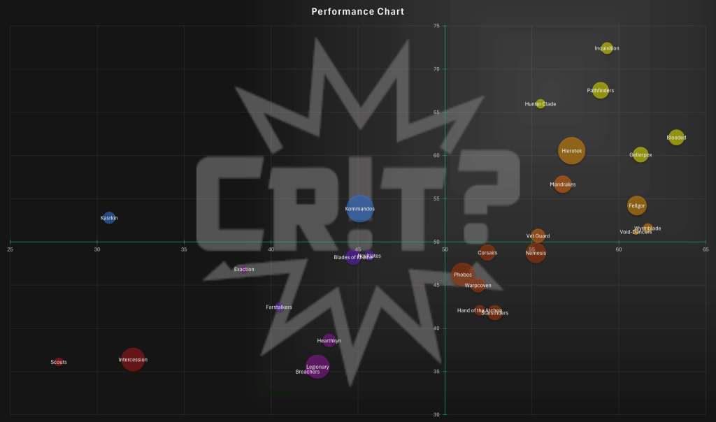 For GT+ Wyrmblade shoot up to 68%, Inq at 67%, Gellerpox at 64%, Chaos Cult at 63%, Pathfinders 60%, Hierotek 59%, Exaction at 57%, and Phobos at 57%. For under-performers we have Breachers at 43%, Vet Guard at 42%, Blades at 41%, Intercession at 40%, Kasrkin at 39%, Scouts at 36%, Kroot at 35%.