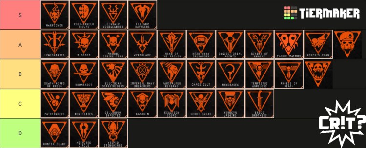D Tier – Bad kill teams. Weak due to either poor rules or mechanics. Unlikely to win with, commonly going 1 win and 3 losses at an event.